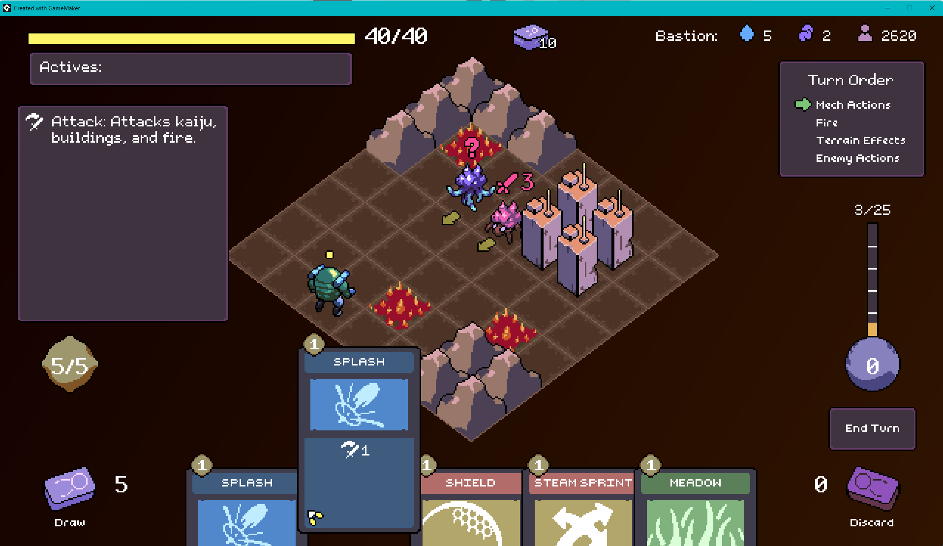FIRE TACTICS is a game about shepherding the last bastion of humanity through a fire-torn Earth in the hopefully distant future. You'll combat flames, giant monster kaiju, and more in turn based battles, your actions all determined by the cards you draft. That's right, there's turn based tactics on a grid, there are cards, there's deckbuilding, and there's giant mechs punching kaiju into buildings to deal damage!